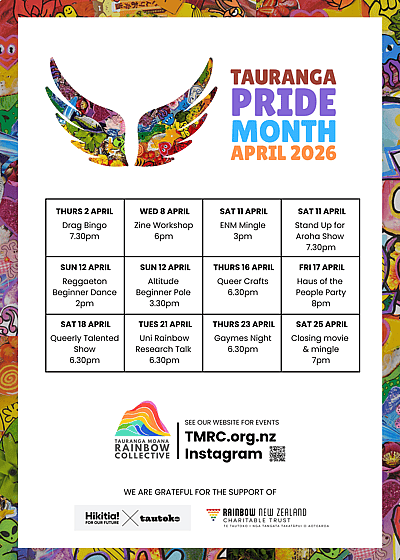 And our supporters: Our local businesses and community, including Curves of Plenty, Luxe Cinemas, BOP Pride, Totara St., Rotorua Chamber of Pride, NeverTheLess, Rusty's Tauranga, Tuatara Collective, Altitude Pole and Fitness, Miss Vibes Events, University of Waikato, Creative BOP, Tauranga City Libraries, Ōkahukura, Kūwao, Aom Dance, The Incubator, RainbowYouth, RocketSpark, BayCourt, our poster artists Lisa.C & StabbyLuv, and to all our dedicated community volunteers at Tauranga Moana Rainbow Collective <3
