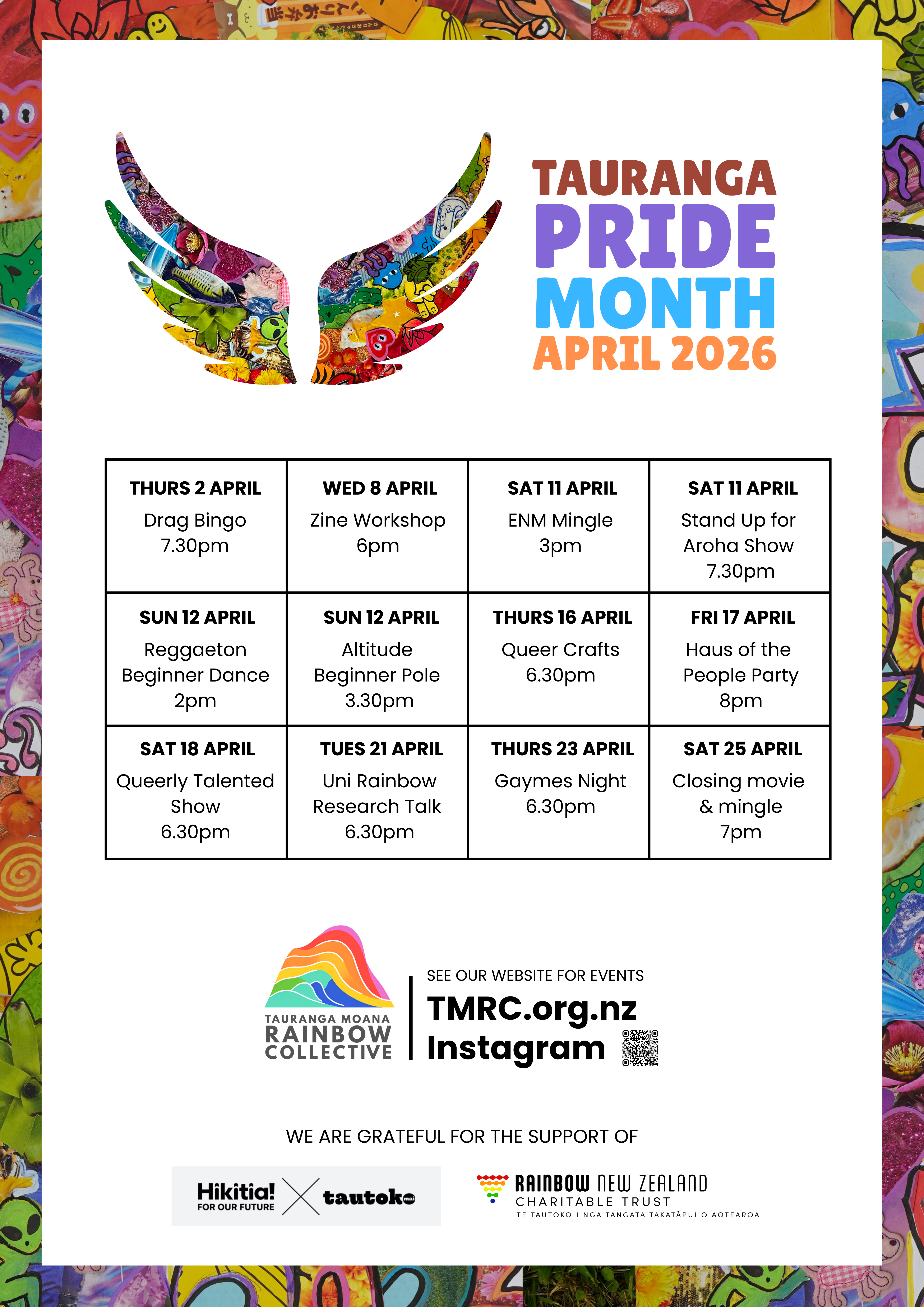 And our supporters: Our local businesses and community, including Curves of Plenty, Luxe Cinemas, BOP Pride, Totara St., Rotorua Chamber of Pride, NeverTheLess, Rusty's Tauranga, Tuatara Collective, Altitude Pole and Fitness, Miss Vibes Events, University of Waikato, Creative BOP, Tauranga City Libraries, Ōkahukura, Kūwao, Aom Dance, The Incubator, RainbowYouth, RocketSpark, BayCourt, our poster artists Lisa.C & StabbyLuv, and to all our dedicated community volunteers at Tauranga Moana Rainbow Collective <3